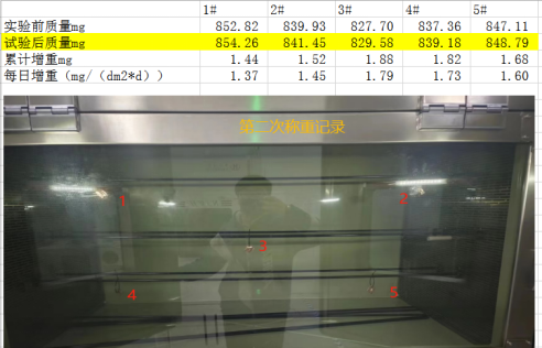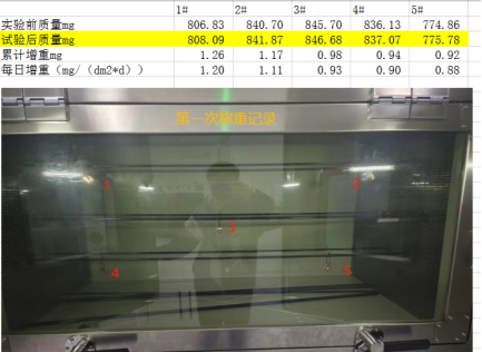 2023年浙江******產(chǎn)品檢驗有限公司第二次采購我司一臺型號為“WHQ-900B”型的混合氣體腐蝕試驗箱,設(shè)備在出廠之前,工作人員已經(jīng)在我內(nèi)部的實驗室進行過一次合格的銅片增重測試,之后設(shè)備被運送到客戶指定的場地安裝調(diào)試運行??蛻粼谠O(shè)備運行了一個階段后,自行進行一次銅片增重試驗,試驗結(jié)束之后客戶將數(shù)據(jù)發(fā)給我司,以下是客戶和我的聊天記錄和客戶第一次做的數(shù)據(jù):