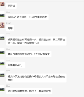 2024年8月份重慶******第三方檢測公司再次采購我司一臺型號為“WHQ-300B”型的混合氣體腐蝕試驗(yàn)箱,設(shè)備被運(yùn)送到客戶指定的場地安裝調(diào)試運(yùn)行。客戶后期自行進(jìn)行一次銅片增重試驗(yàn),起初試驗(yàn)結(jié)果不是很理想,,試驗(yàn)的流程和注意事項(xiàng)未了解透徹,我司針對以上信息,整理了操作指導(dǎo)作業(yè)書進(jìn)行幫助理解;通過理論知識和我司技術(shù)人員線上指導(dǎo)操作的配合,該增重試驗(yàn)很成功。試驗(yàn)結(jié)束之后客戶將數(shù)據(jù)發(fā)給我司,以下是客戶和我司聊天記錄以及客戶做的數(shù)據(jù)信息: